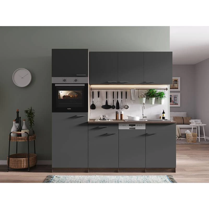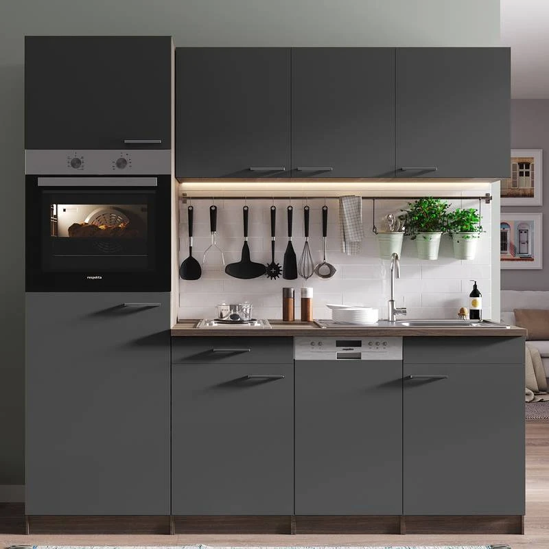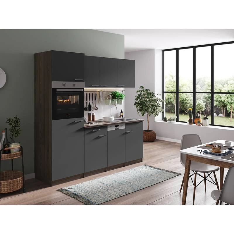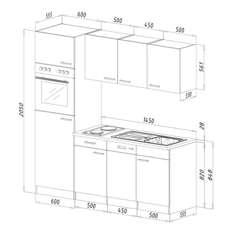 - Cuisine composée de 1 évier encastré 8 x 4 en inox avec vidage et trop-plein, 1 armoire pour réfrigérateur et four 60 cm, 1 niche avec panneau décoratif pour lave-vaisselle 45 cm, 1 plan de travail 28 mm sans découpes (145 cm), 1 meuble bas avec tiroir 50 cm, 1 meuble sous évier 50 cm, 2 armoires suspendues 50 cm, 1 armoire suspendue 45 cm