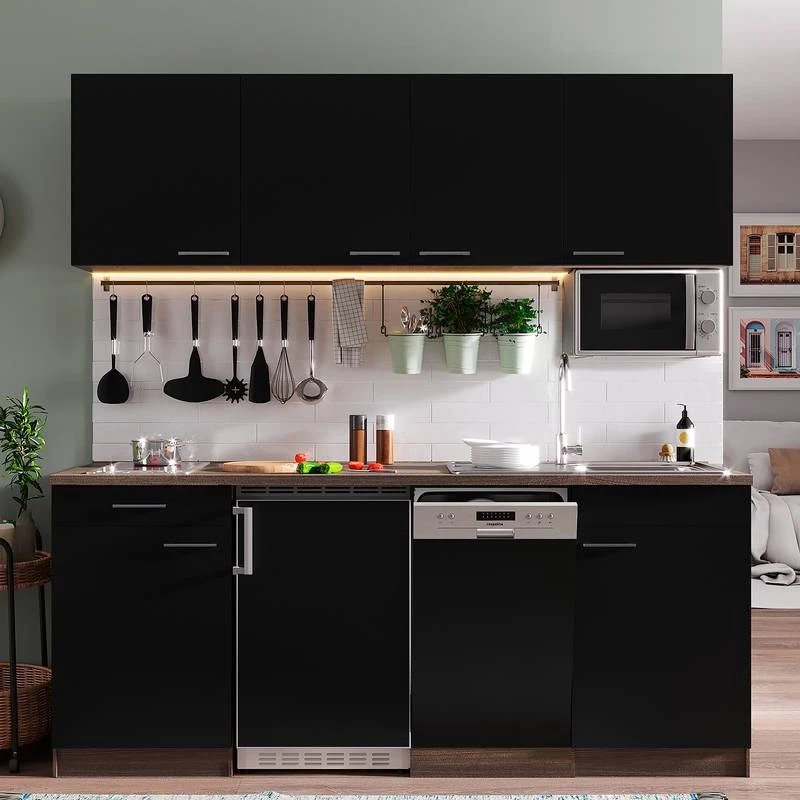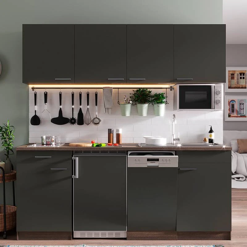 - Électroménager inclus : 1 réfrigérateur sous plan avec compartiment congélateur, 1 plaque de cuisson vitrocéramique, 1 micro-ondes (encastrable) & 1 lave-vaisselle semi-intégré