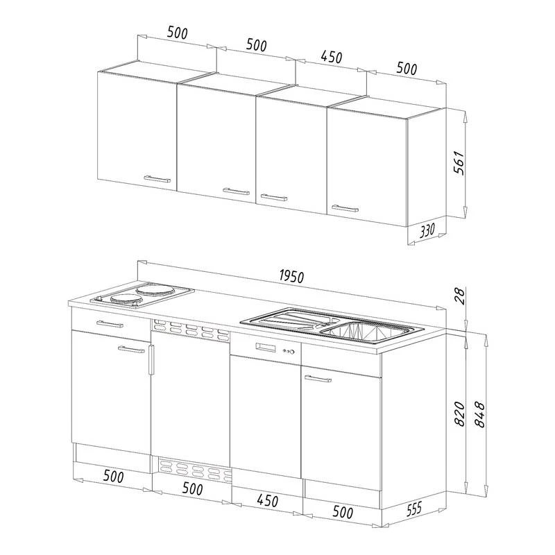 - Cuisine composée de 1 évier inox encastré avec vidage et trop-plein, 1 niche avec panneau décoratif pour lave-vaisselle 45 cm, 1 plan de travail (28 mm) sans découpe, 1 armoire basse avec tiroir 50 cm, 1 meuble sous évier 50 cm, 3 armoires suspendues 50 cm et 1 armoire suspendue 45 cm