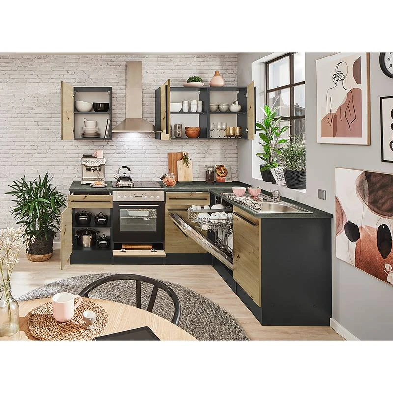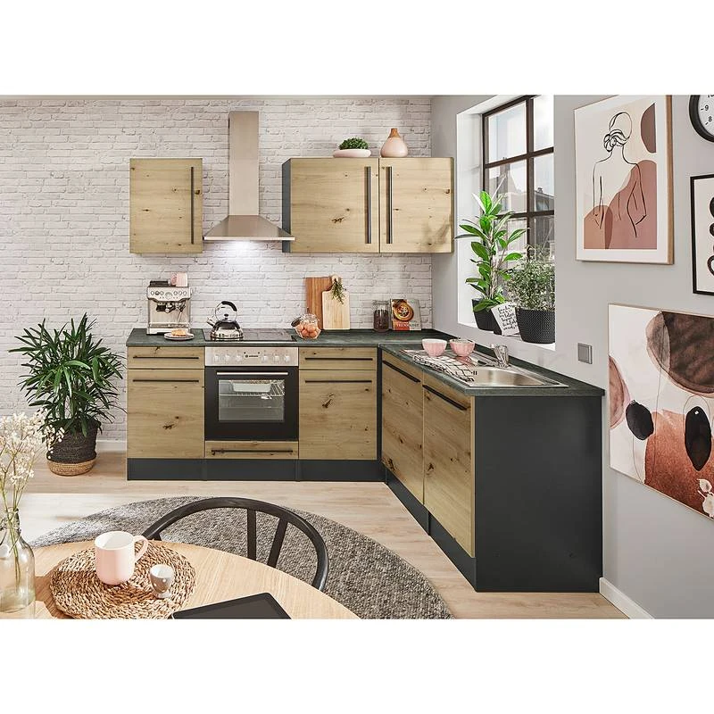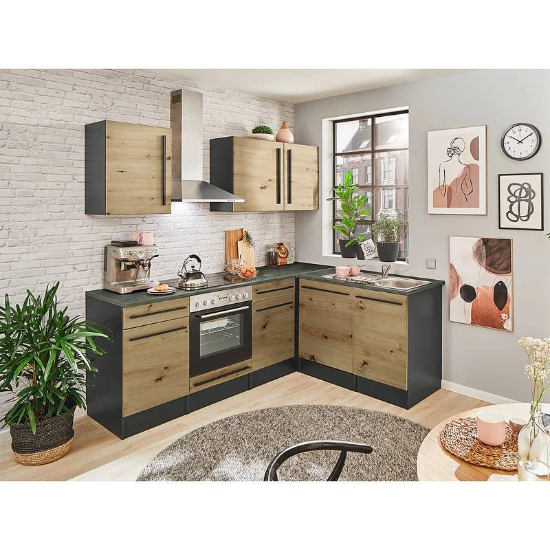 - Cuisine équipée se composant de 1 meuble bas avec tiroir, 1 meuble pour cuisinière encastrée, 1 élément bas pour évier 50 cm (avec panneau de porte pour lave-vaisselle), 1 meuble d’angle, 2 meubles hauts de 50 cm, 1 meuble haut de 60 cm, 1 plan de travail et 1 plinthe (continue)