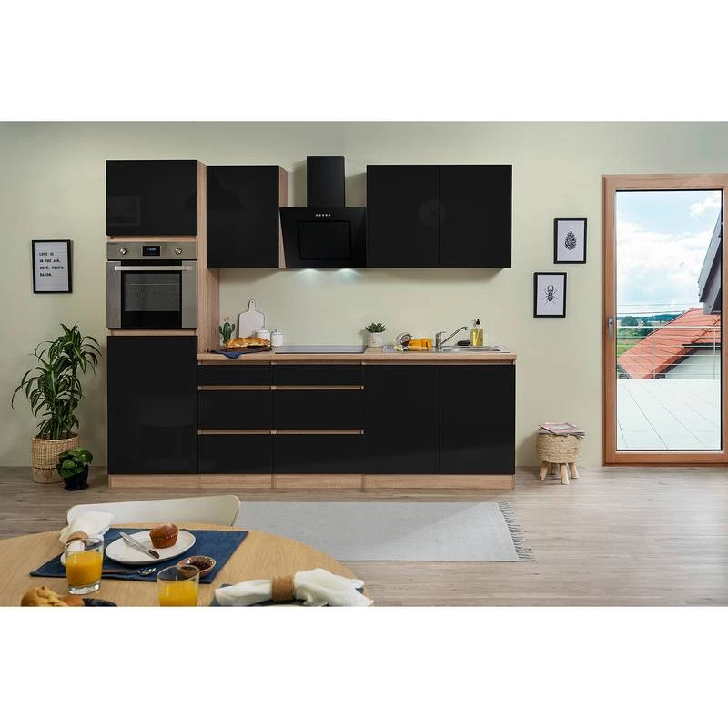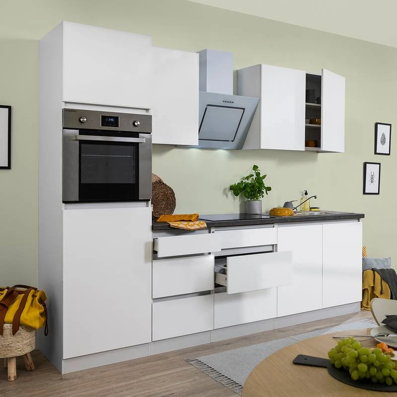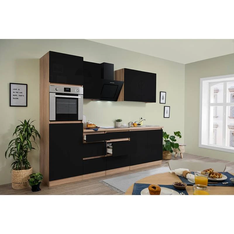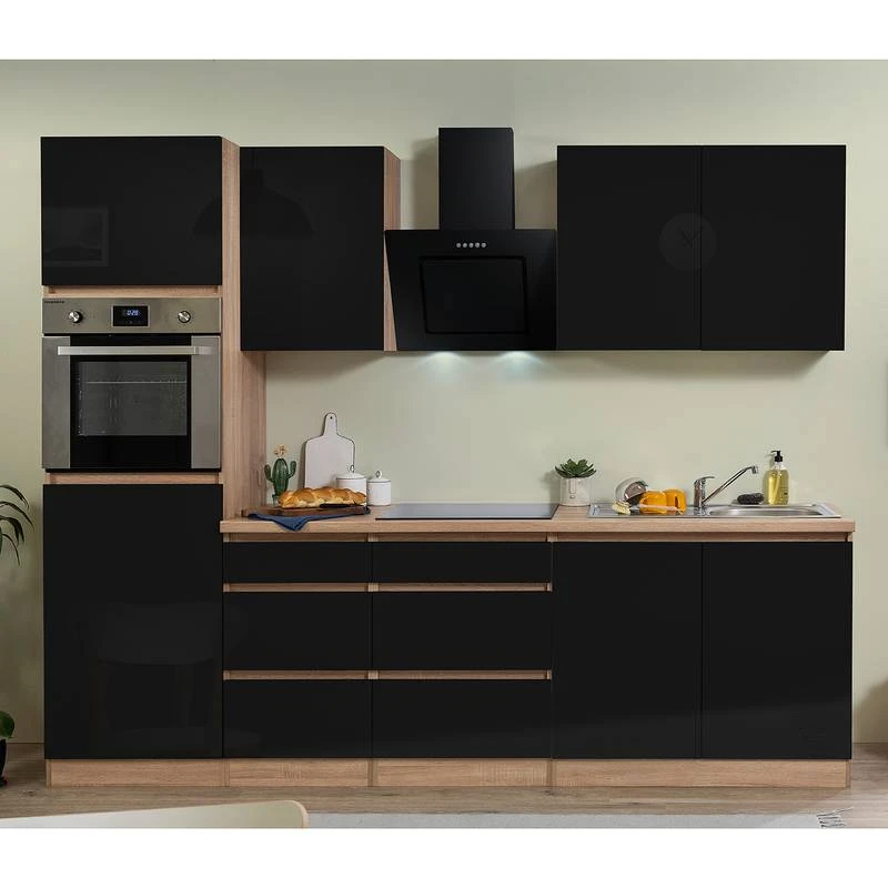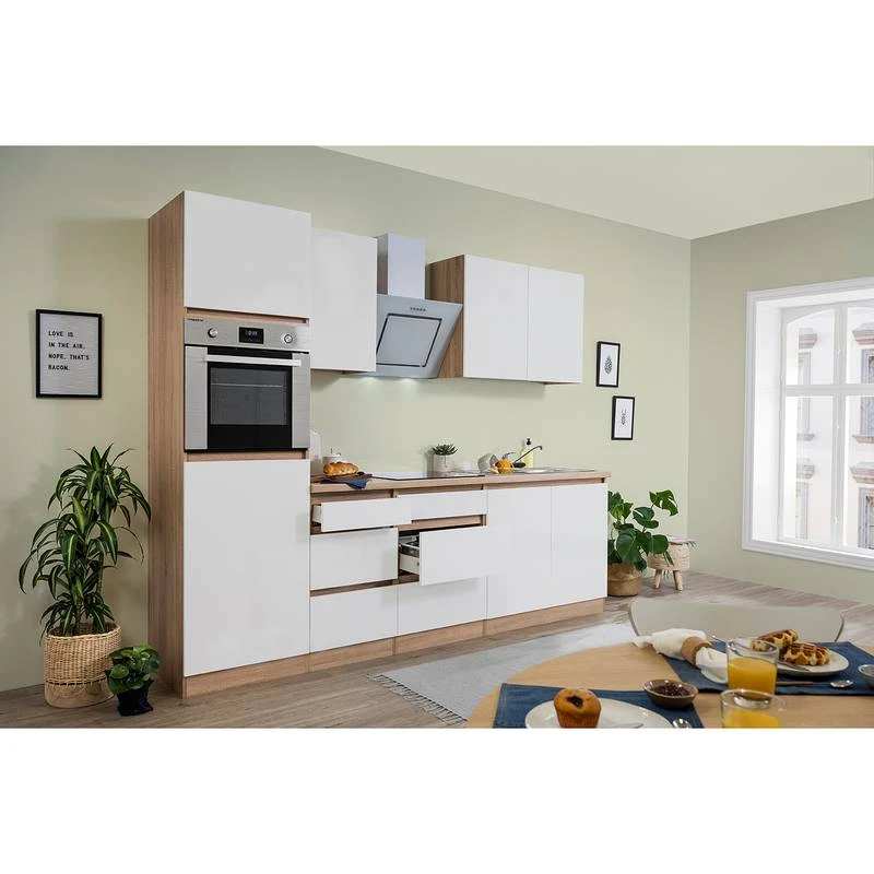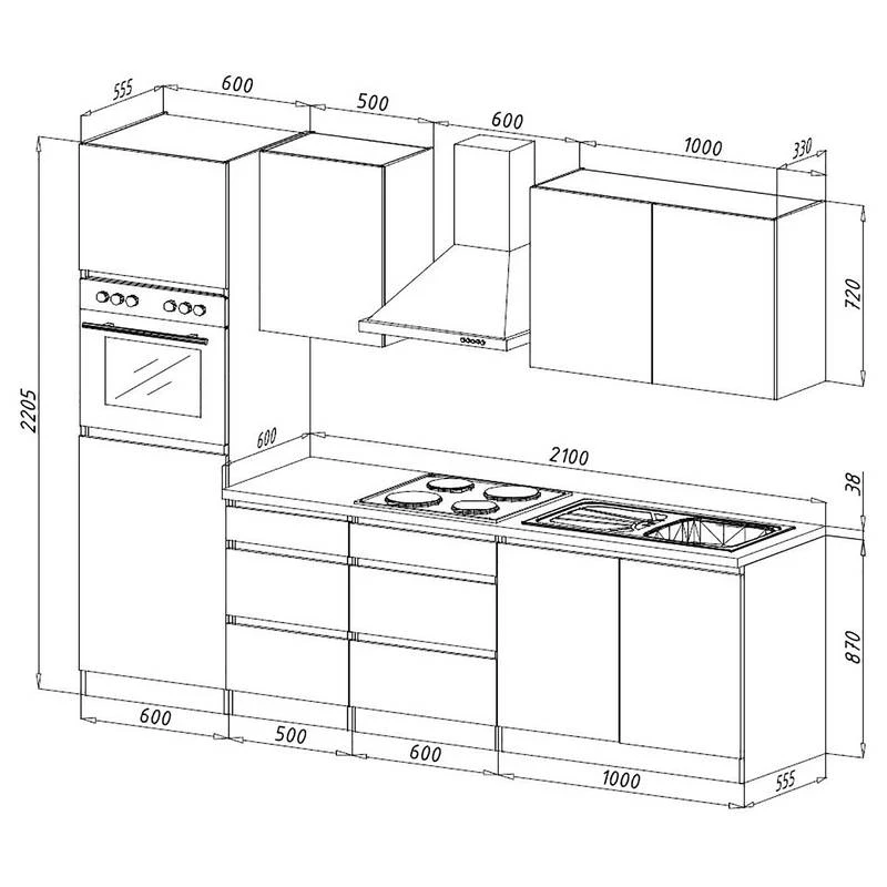 - Cuisine équipée comprenant 1 meuble pour réfrigérateur et four encastrables de 60 cm, 1 meuble bas de 50 cm, 1 meuble bas pour plaque de cuisson de 60 cm, 1 meuble sous évier de 50 cm, 1 évier encastrable en acier inoxydable avec évacuation et trop plein, 1 meuble haut de 50 cm, 1 meuble haut de 100 cm et 1 plan de travail