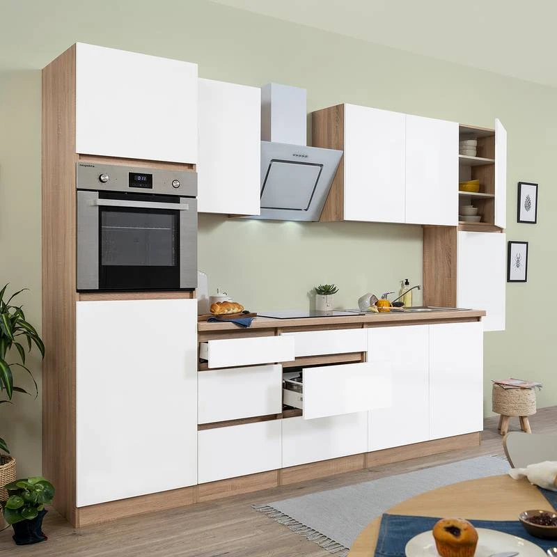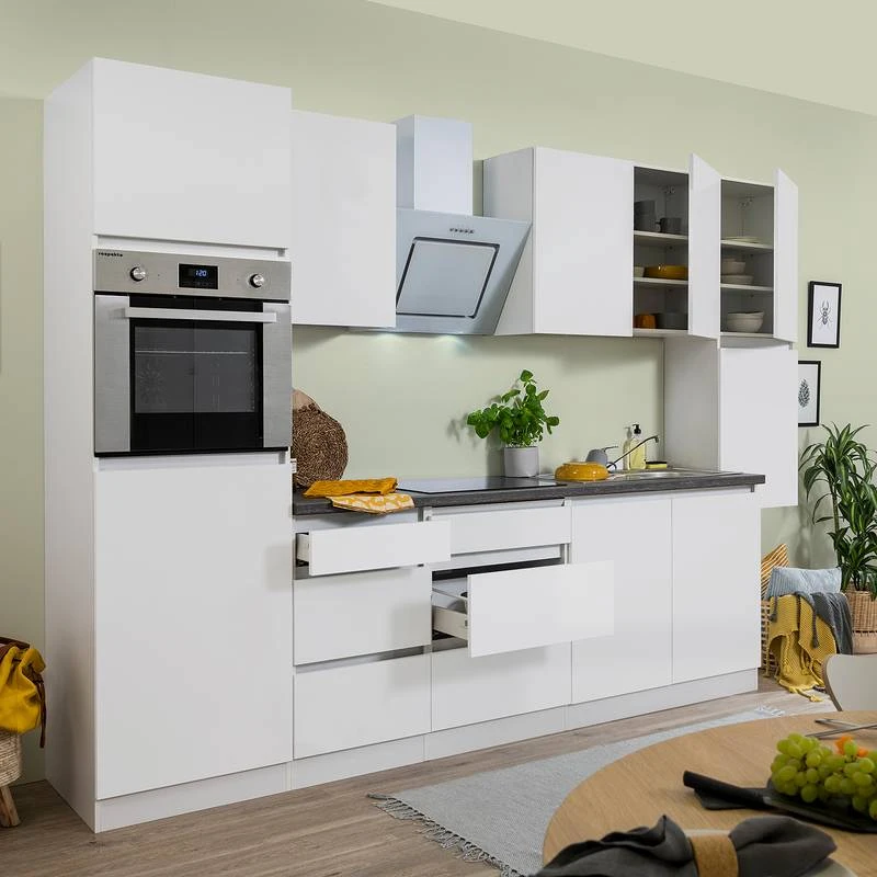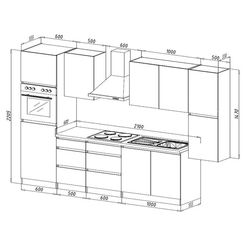 - Cuisine équipée comprenant 1 meuble pour réfrigérateur et four encastrables de 60 cm, 1 meuble bas de 50 cm, 1 meuble bas pour plaque de cuisson de 60 cm, 1 meuble sous évier de 100 cm, 1 évier encastrable en acier inoxydable avec évacuation et trop plein, 1 armoire latérale de 50 cm, 1 meuble haut de 50 cm, 1 meuble haut de 100 cm et 1 plan de travail