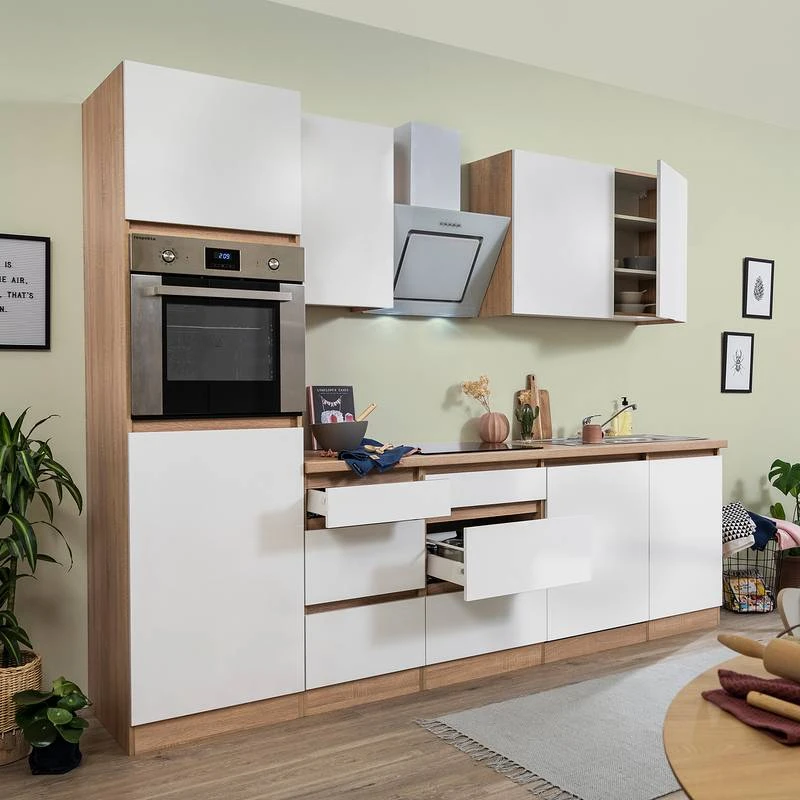 - Cuisine équipée comprenant 1 meuble pour réfrigérateur et four encastrables de 60 cm, 1 meuble bas de 50 cm, 1 meuble bas pour plaque de cuisson de 60 cm, 1 meuble sous évier de 50 cm, 1 évier encastrable en acier inoxydable avec évacuation et trop plein, 1 caisson pour lave-vaisselle de 60 cm, 1 meuble haut de 50 cm, 1 meuble haut de 110 cm et 1 plan de travail