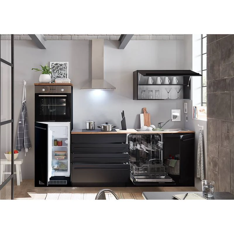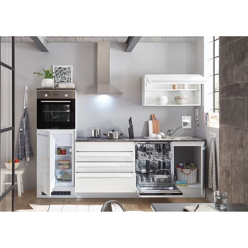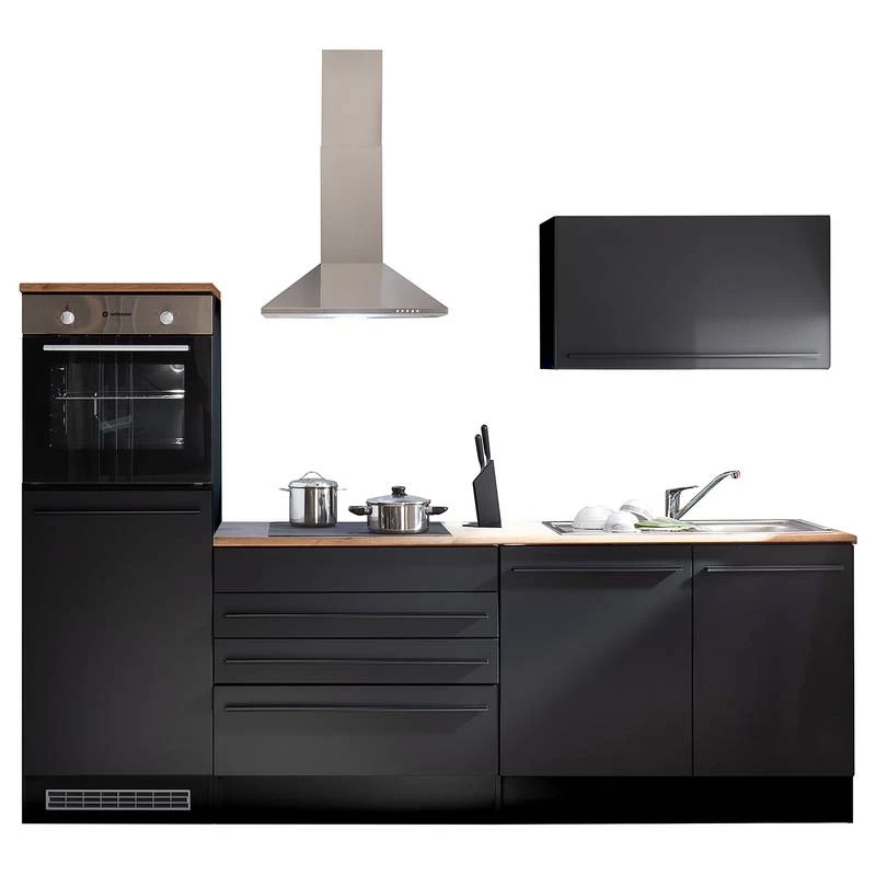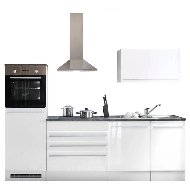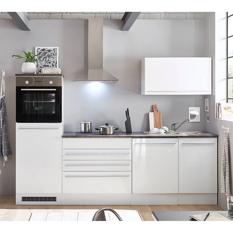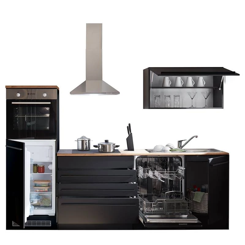 - Cuisine composée de 1 armoire murale 90 cm, 1 meuble bas 90 cm, 1 meuble sous évier 50 cm, 1 meuble pour cuisinière et réfrigérateur encastrés 60 cm et 1 plan de travail