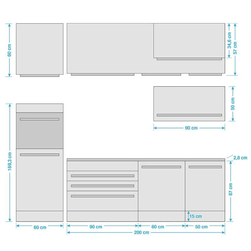 - Plan de travail (L x H x P) : 200 x 2,8 x 60 cm