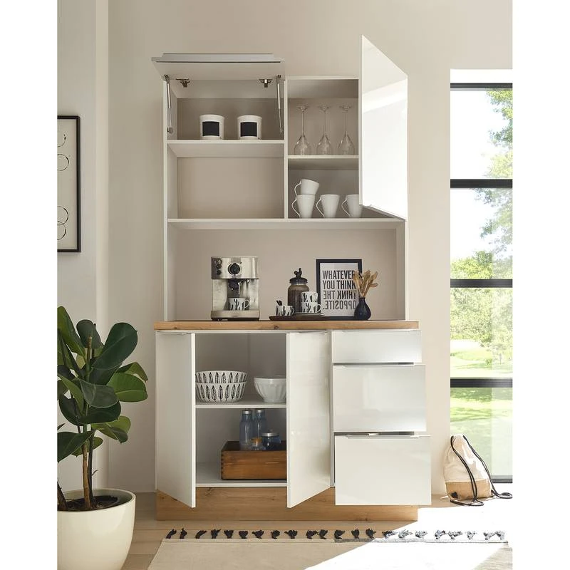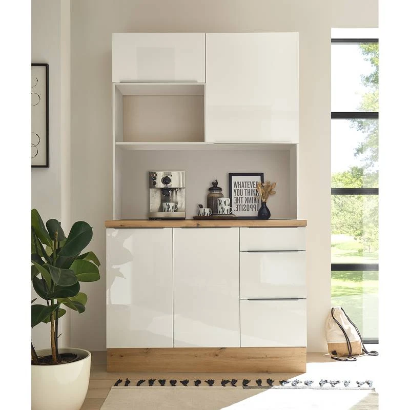 - Cuisine composée de 1 meuble bas avec deux portes, 1 meuble bas avec tiroirs de 40 cm, 1 meuble haut avec porte relevable de 60 cm, 1 étagère de 60 cm, 1 meuble haut de 60 cm et 1 plan de travail de 120 cm