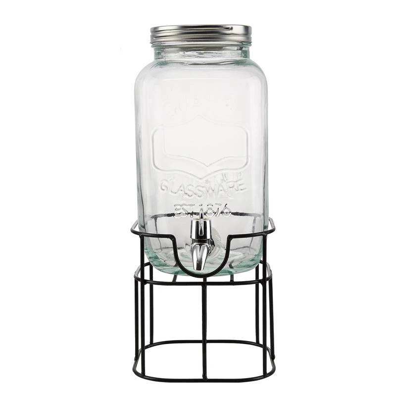 - Fontaine à boisson : Longueur 14,5 cm x largeur 14,5 cm x hauteur 27 cm, contenance : 3,5 L, support métallique : largeur 15,5 x profondeur 15,5 x hauteur 20 cm